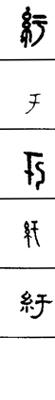 从上到下依次是小篆、甲骨文、金文、古玺及战国文字、缪篆及汉代文字、鸟虫篆。