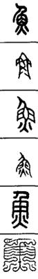 从上到下依次是小篆、甲骨文、金文、古玺及战国文字、缪篆及汉代文字、鸟虫篆。