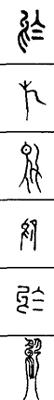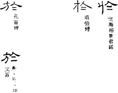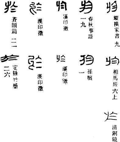 从上到下依次是小篆、甲骨文、金文、古玺及战国文字、缪篆及汉代文字、鸟虫篆。