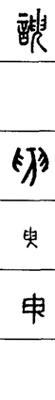 从上到下依次是小篆、甲骨文、金文、古玺及战国文字、缪篆及汉代文字、鸟虫篆。