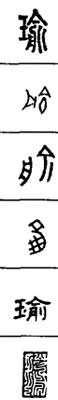 从上到下依次是小篆、甲骨文、金文、古玺及战国文字、缪篆及汉代文字、鸟虫篆。