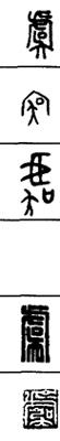 从上到下依次是小篆、甲骨文、金文、古玺及战国文字、缪篆及汉代文字、鸟虫篆。