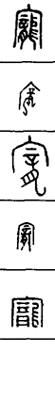 从上到下依次是小篆、甲骨文、金文、古玺及战国文字、缪篆及汉代文字、鸟虫篆。