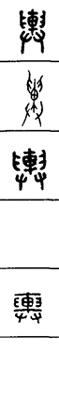 从上到下依次是小篆、甲骨文、金文、古玺及战国文字、缪篆及汉代文字、鸟虫篆。