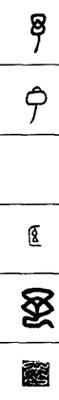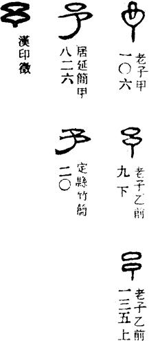 从上到下依次是小篆、甲骨文、金文、古玺及战国文字、缪篆及汉代文字、鸟虫篆。