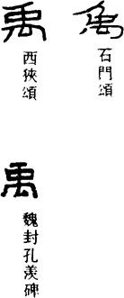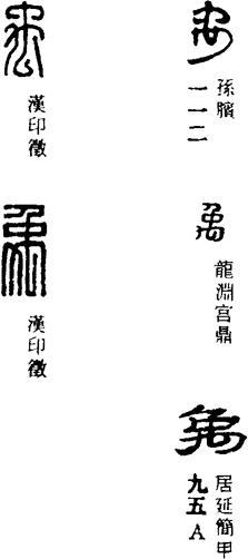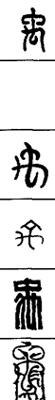 从上到下依次是小篆、甲骨文、金文、古玺及战国文字、缪篆及汉代文字、鸟虫篆。