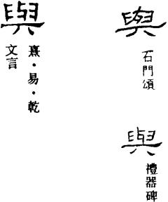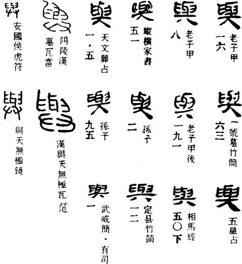 馬王堆帛書《六十四卦·師》六三:“師或與(尸),凶。”與通行本《易》作輿。爻言軍旅出征,以輿載尸而還,是凶矣。又廿八宿漆書“與鬼”。《史記·天官書》:“輿鬼,鬼祠事。”按《左傳·襄公三十一年》:“莒犁比公生去疾及展輿。”釋文:“輿本又作與。”