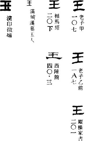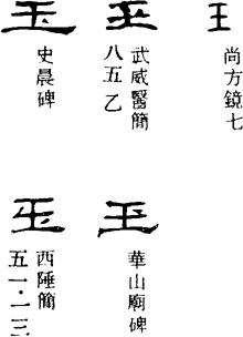 〈辨〉玉字甲骨文象玉串的形状,为象形字。金文、篆书字形讹变;特别是篆书,和王字的区别只在于中间横画的居中还是靠上。楷书作玉,以点的有无区别于王字。玉字用为偏旁,表示和玉有关的意思,偶尔也作声符。楷书中用为在左的偏旁时作