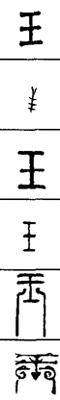 从上到下依次是小篆、甲骨文、金文、古玺及战国文字、缪篆及汉代文字、鸟虫篆。