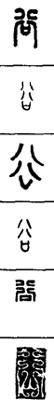 从上到下依次是小篆、甲骨文、金文、古玺及战国文字、缪篆及汉代文字、鸟虫篆。