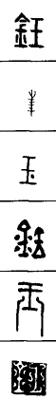 从上到下依次是小篆、甲骨文、金文、古玺及战国文字、缪篆及汉代文字、鸟虫篆。
