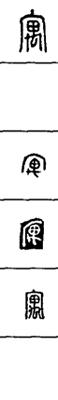 从上到下依次是小篆、甲骨文、金文、古玺及战国文字、缪篆及汉代文字、鸟虫篆。