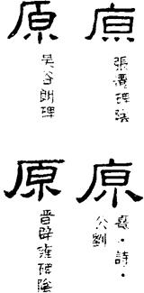 ㈠ yuán ①水源。后来写作“源”。《左传·昭公九年》:“拔木塞原。”《墨子·修身》:“原浊者流不清。”引申为本原,根本。《韩非子·解老》:“兕虎有域,而万害有原。”(域:指活动区域。)《礼记·孔子闲居》:“必达于礼乐之原。”②推求,推究。《周易·系辞下》:“《易》之为书也,原始要终以为质也。”(原始要yāo终:探究事物发展的始末。)《汉书·王嘉传》:“圣王断狱,必先原心定罪,探意立情。”③宽阔平坦的地方,原野。《左传·隐公六年》:“如火之燎于原。”杜甫《日暮》:“草露满秋原。”④宽恕,原谅。《史记·高祖本纪》:“城降,令出骂者斩之,不骂者原之。”江淹《建平王赦五刑教》:“自五岁刑已下未送台者,一皆原遣。”(台:官署名。遣:释放。)