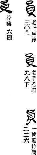 郭店楚簡本《老子》乙簡三~四:“學者日益,為道者日員。員之或(又)員,以至亡為也。”員馬王堆帛書《老子》乙本作云,王弼本作損。按劉信芳《釋詁》將員字隸作異,别有新解,然此與郭店楚簡異字(《郭店楚簡文字編》二九七頁)仍有差距,故仍依傳本讀損。且道在老子看來,只是自然之道,無所謂異。郭店楚簡《唐峂之道》簡一九:“又(有)天下弗能益,亡天下弗能員。”郭店楚簡《語叢三》簡一一~一三:“牙(與)