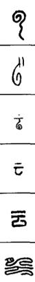从上到下依次是小篆、甲骨文、金文、古玺及战国文字、缪篆及汉代文字、鸟虫篆。