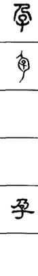 【说明】“孕”为象形字,像人大腹之形,子在腹中。参附录三。