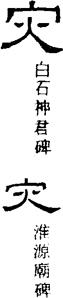 〈辨〉灾害的灾字,因为起因不同,古文字用不同的字表示:水灾字甲骨文有三体,有的象洪水横流之形,有的从川从一,象河道堵塞的形状;有的作从川省才声。篆书取其一,以从川从一的指事字为篆书形体。楷书作