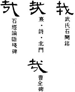 从上到下依次是小篆、甲骨文、金文、古玺及战国文字、缪篆及汉代文字、鸟虫篆。