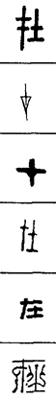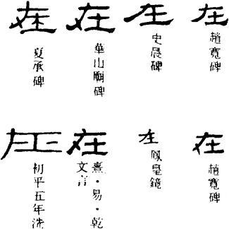 从上到下依次是小篆、甲骨文、金文、古玺及战国文字、缪篆及汉代文字、鸟虫篆。
