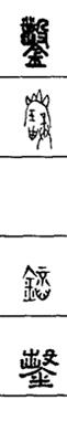 从上到下依次是小篆、甲骨文、金文、古玺及战国文字、缪篆及汉代文字、鸟虫篆。