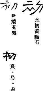 ①开始。《周易·既济》:“初吉终乱。”《韩非子·解老》:“初盛而后衰者,不可谓常。”又为本原。《庄子·缮性》:“无以反其性情而复其初。”引申为序次居第一。《周易·乾》:“初九:潜龙,勿用。”(初九:《周易》每卦六爻,爻分阴阳,第一爻为阳爻者,称“初九”。)②当初。《左传·隐公元年》:“初,郑武公娶于申。”《韩非子·外储说左下》:“怨子如初也。”又为本,本来。《搜神记》卷十五:“既不契于初心,生死永诀。”方文《子房山》:“助汉以诛秦,初非好功业。”③才,刚刚。《史记·汉兴以来诸侯王年表》:“天下初定,骨肉同姓少。”《资治通鉴·汉献帝建安十三年》:“初一交战,操军不利。”(操:曹操。)