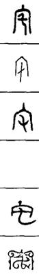 从上到下依次是小篆、甲骨文、金文、古玺及战国文字、缪篆及汉代文字、鸟虫篆。