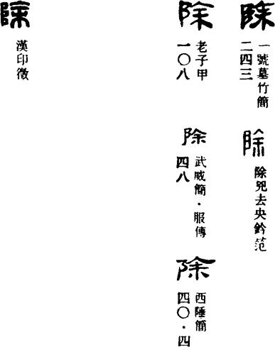 从上到下依次是小篆、甲骨文、金文、古玺及战国文字、缪篆及汉代文字、鸟虫篆。