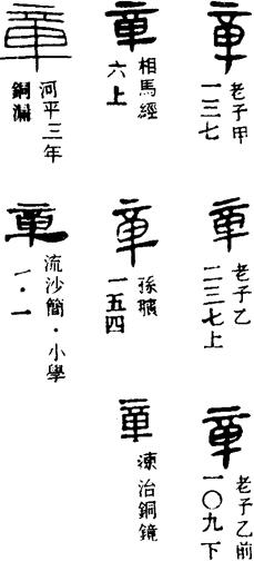 从上到下依次是小篆、甲骨文、金文、古玺及战国文字、缪篆及汉代文字、鸟虫篆。