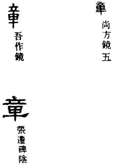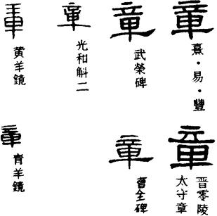〈辨〉章字金文不从音、十,但所象难明,有人认为是璋的象形,璋为古代的一种玉器。篆书讹变作章;从音从十,十为十进位数的最后一位,超过十就又从一算起,音乐的乐章也如此,可以反复演奏。