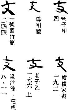 从上到下依次是小篆、甲骨文、金文、古玺及战国文字、缪篆及汉代文字、鸟虫篆。