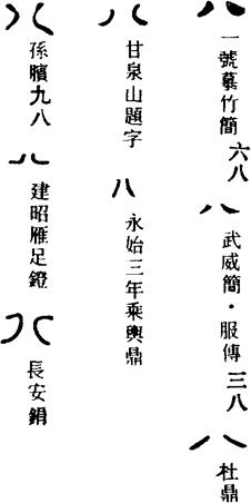 数词,八。《左传·庄公十四年》:“庄公之子犹有八人。”又为序数,第八。《诗经·豳风·七月》:“八月其获。”《左传·僖公八年》:“八年春,盟于洮。”(洮:地名。)