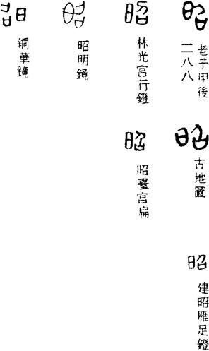 ①明,光明。《诗经·大雅·既醉》:“君子万年,介尔昭明。”(介:赐予。)《吕氏春秋·任数》:“目之见也藉于昭。”(藉:凭借。)引申为显示,彰明。《左传·襄公十九年》:“昭明德而惩无礼也。”诸葛亮《出师表》:“论其刑赏,以昭陛下平明之理。”(理:治。)[昭昭]1.明亮的样子。屈原《九歌·云中君》:“烂昭昭兮未央。”(未央:未尽。)《史记·天官书》:“昭昭有光。”2.明白的样子。《老子》第二十章:“俗人昭昭。”《孟子·尽心下》:“贤者以其昭昭使人昭昭。”②古代宗庙制度,始祖居中,以下依辈分左右相次,居左者为昭,居右者为穆。《左传·僖公五年》·“大伯虞仲,大王之昭也。”(大tài伯、虞仲:大tài王之子。)