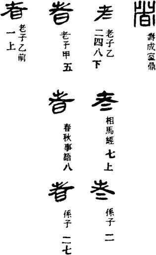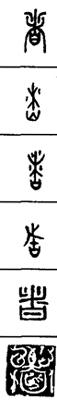 从上到下依次是小篆、甲骨文、金文、古玺及战国文字、缪篆及汉代文字、鸟虫篆。