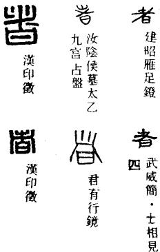 (佑)晉公左右燮者侯……者侯羞元金于子凫(犯)之所……”又《吉林大學藏古璽印集》四三:“者(海)。”《珍秦齋秦印展》六五:“者虖。”姓氏通作諸。《萬姓統譜》魚韻:“諸,越大夫諸稽郢之後。周諸御己……諸御鞅,齊大夫。”《十鐘》三·一四有“諸夷”。《漢印文字徵》三·四有“諸克”、“諸不梁”。又安徽淮南蔡家崗墓出有“戉(越)王者旨於睗(賜)”戈二件,“者旨於睗”器尚有鐘、矛、剑等。“者旨”讀為“諸稽”,複姓。《姓氏急就篇》:“《國語》彭姓,越有諸稽郢。”又長沙子彈庫楚帛書丙篇:“可以聚衆,會者侯。”又郭店楚簡《成之聞之》簡一〇~一一:“是古(故)君子之求者(己)也深。不求者其