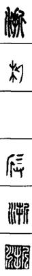 从上到下依次是小篆、甲骨文、金文、古玺及战国文字、缪篆及汉代文字、鸟虫篆。