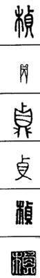 从上到下依次是小篆、甲骨文、金文、古玺及战国文字、缪篆及汉代文字、鸟虫篆。