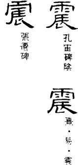 ①疾雷,雷。《诗经·小雅·十月之交》:“烨烨震电。”(烨烨:电光闪耀的样子。)《左传·隐公九年》:“大雨霖以震。”又为雷击。《春秋·僖公十五年》:“震伯夷之庙。”[震震]1.雷声。古诗《上邪》:“冬雷震震。”2.威严的样子。《太玄·释》:“震震不侮。”②震动。《诗经·鲁颂·閟宫》:“不亏不崩,不震不腾。”特指地震。《国语·周语上》:“幽王二年,西周三川皆震。”《后汉书·张衡传》:“寻其方面,乃知震之所在。”引申为震惊,惊恐。《诗经·大雅·常武》:“如雷如霆,徐方震惊。”(徐方:江淮一带的方国名。)《三国志·蜀书·马超传》:“城中震怖。”③威严,气盛。《左传·文公六年》:“其子何震之有?”左思《咏史》之六:“荆轲饮燕市,酒酣气益震。”又为震怒,怒。《尚书·洪范》:“帝乃震怒。”《太玄·释》:“震于廷。”④通“娠”。怀孕。《诗经·大雅·生民》:“载震载夙,载生载育。”(夙:通“肃”,指生活严肃。)