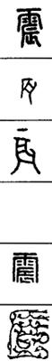 从上到下依次是小篆、甲骨文、金文、古玺及战国文字、缪篆及汉代文字、鸟虫篆。