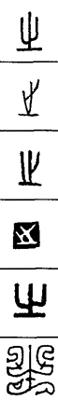 从上到下依次是小篆、甲骨文、金文、古玺及战国文字、缪篆及汉代文字、鸟虫篆。