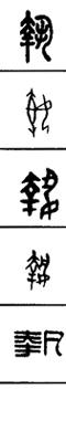 从上到下依次是小篆、甲骨文、金文、古玺及战国文字、缪篆及汉代文字、鸟虫篆。