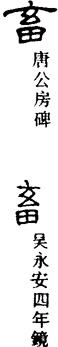 〈辨〉畜字甲金文从玄从田,表示菽粟之类成熟时一串一串悬在田中;玄义为悬,详玄字下。篆书有二体,一同甲金文从玄从田,后人解为黑土肥沃多收;一作从兹从田,表示田中生长出来的东西。兹读zī,义为草木多益。楷书作畜。从字形看,畜大概是蓄的本字,蓄,详蓄字下;后来畜借用为家畜、畜生字,其字本当作嘼,详兽字下◇畜字两读,名物字读chù,动作字读xù。