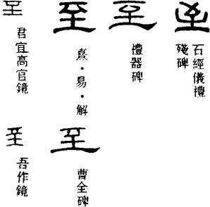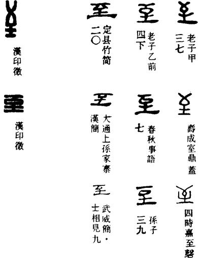 〈辨〉至字甲金文象箭射至目的物表面的样子,当为指事字;篆书稍讹,楷书作至。引申为义项①等。