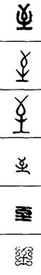 从上到下依次是小篆、甲骨文、金文、古玺及战国文字、缪篆及汉代文字、鸟虫篆。
