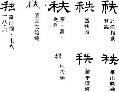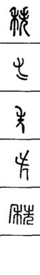 从上到下依次是小篆、甲骨文、金文、古玺及战国文字、缪篆及汉代文字、鸟虫篆。