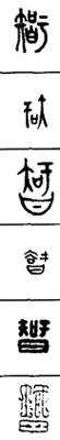 从上到下依次是小篆、甲骨文、金文、古玺及战国文字、缪篆及汉代文字、鸟虫篆。