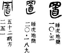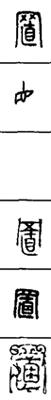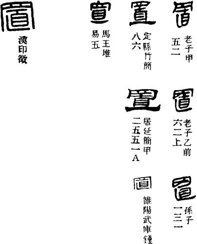从上到下依次是小篆、甲骨文、金文、古玺及战国文字、缪篆及汉代文字、鸟虫篆。