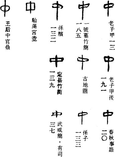 古代的旌旗由多条叫做“斿”(音yóu)的飘带组成。飘带有多有少,其中以王的旗飘带最多,有十二“斿”。甲骨文、金文的中字,象一杆多斿的旗,旗杆中段束扎木块,以加强旗杆的抗折强度。这个木块就叫“中”。由于它位处旗杆中段,把斿中分为上斿下斿,所以中的本义为当中、中间,引申为里面、内中。为人处世中正平和,不偏不倚,无过不及,也叫做“中”,如中行、中庸等。