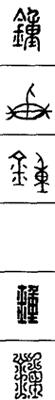 从上到下依次是小篆、甲骨文、金文、古玺及战国文字、缪篆及汉代文字、鸟虫篆。