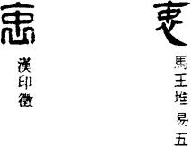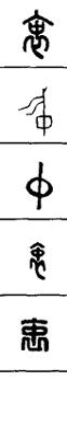 从上到下依次是小篆、甲骨文、金文、古玺及战国文字、缪篆及汉代文字、鸟虫篆。