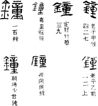 (莒)平鐘、己侯鐘、邾公華鐘等皆如此,但亦有個别例外。《金文編》説金文鐘、鍾一字,符合實際。漢以後鐘、鍾已分化為二字,但通用。韓勑碑:“鍾磬瑟鼓。”此以鍾為鐘。楊著碑:“玄乾鐘德。”此以鐘為鍾。《周禮·考工記》:“鳧氏為鍾。”《通典》引鍾作鐘。《史記·滑稽列傳》:“鼓鍾於宫。”《漢書·東方朔傳》鍾作鐘。